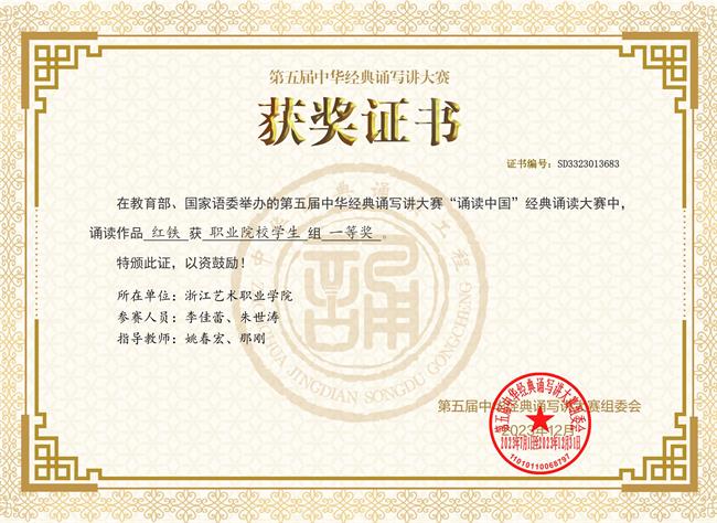 近日,由教育部、国家语委举办的第五届中华经典诵写讲大赛落下帷幕。浙江艺术职业学院戏剧影视学院作品《会唱歌的鸢尾花》和《红铁》在“诵读中国”经典诵读赛项中荣获国家级职业院校学生组一等奖,指导老师那刚、姚春宏、陈宇歌获“优秀指导教师”称号。