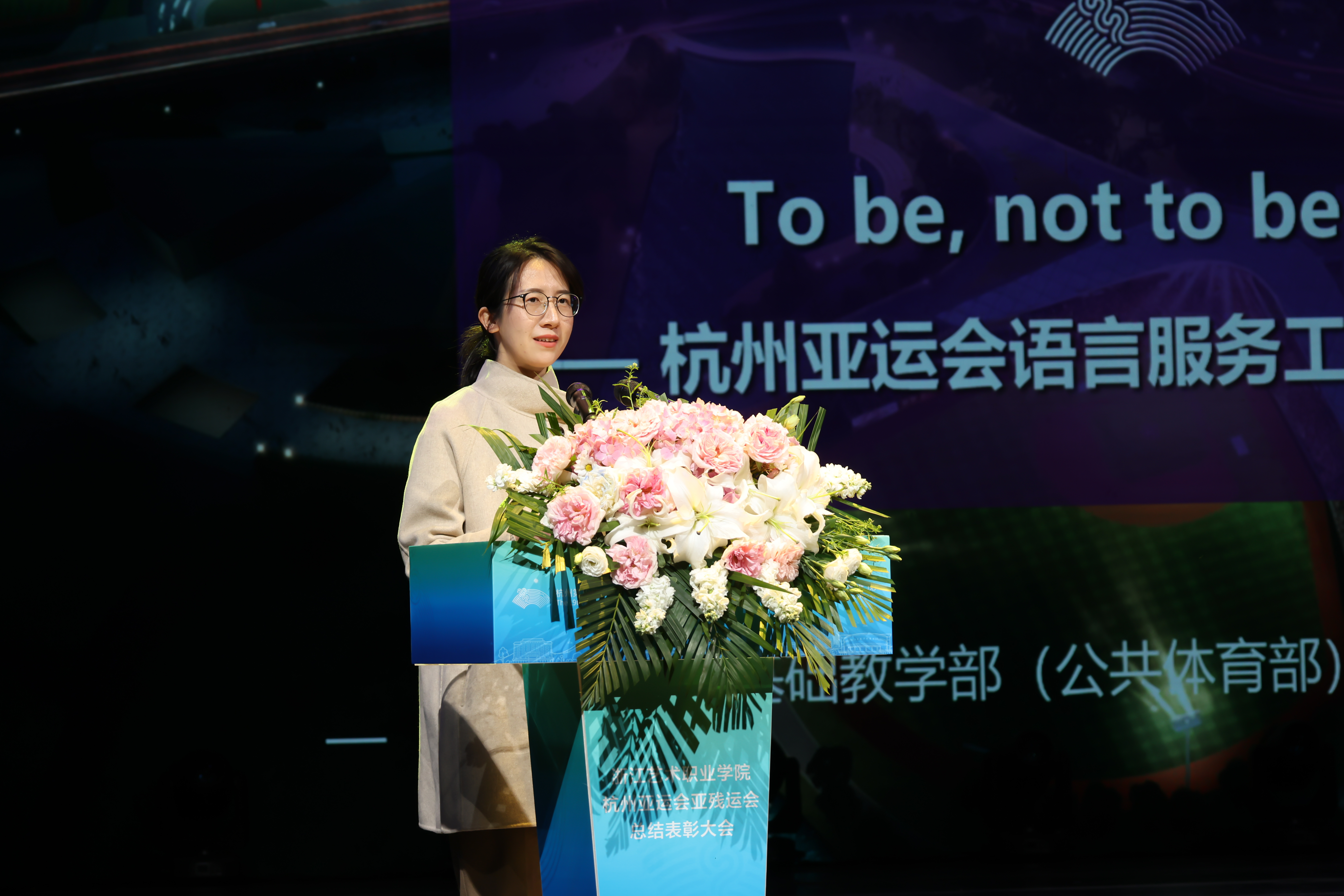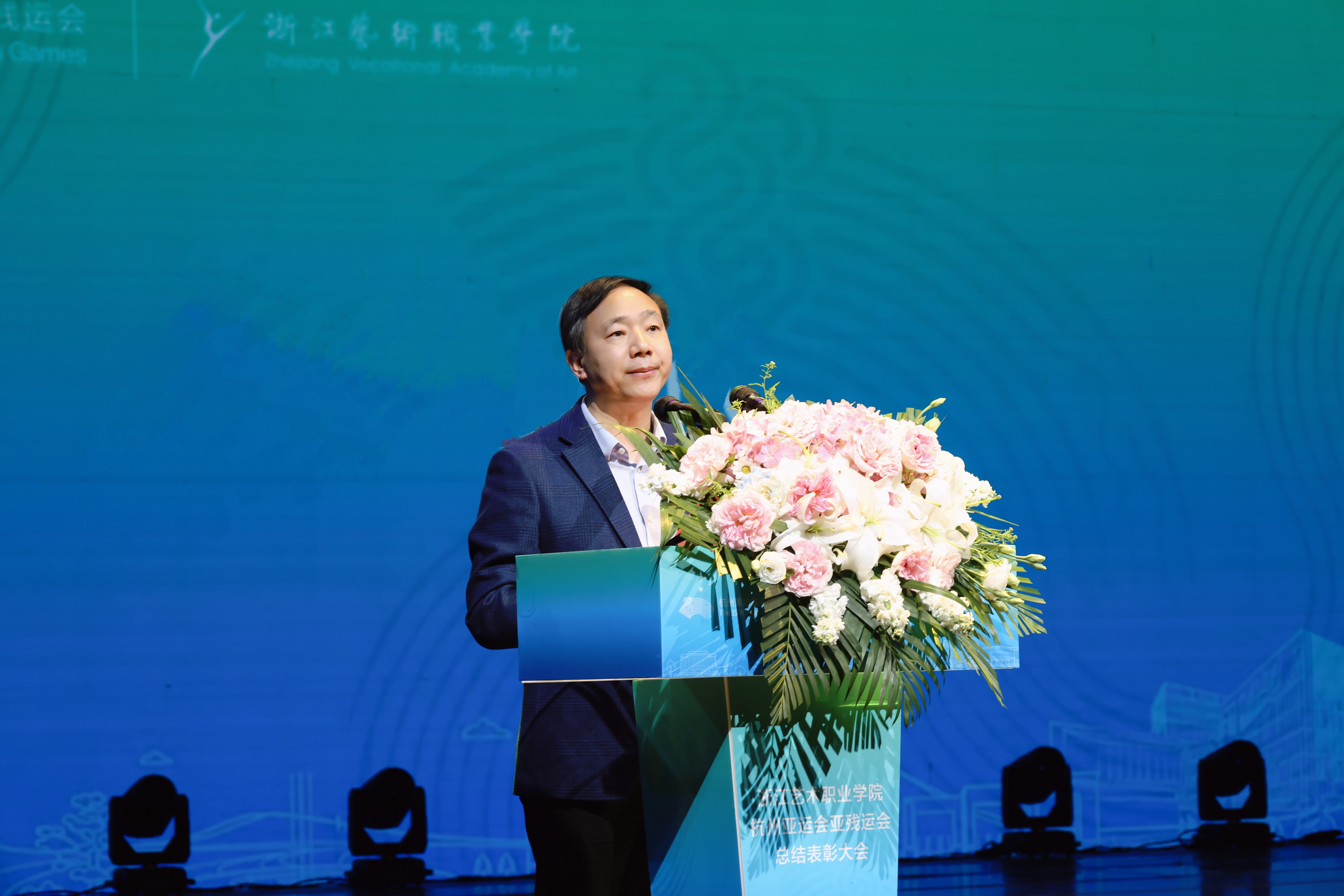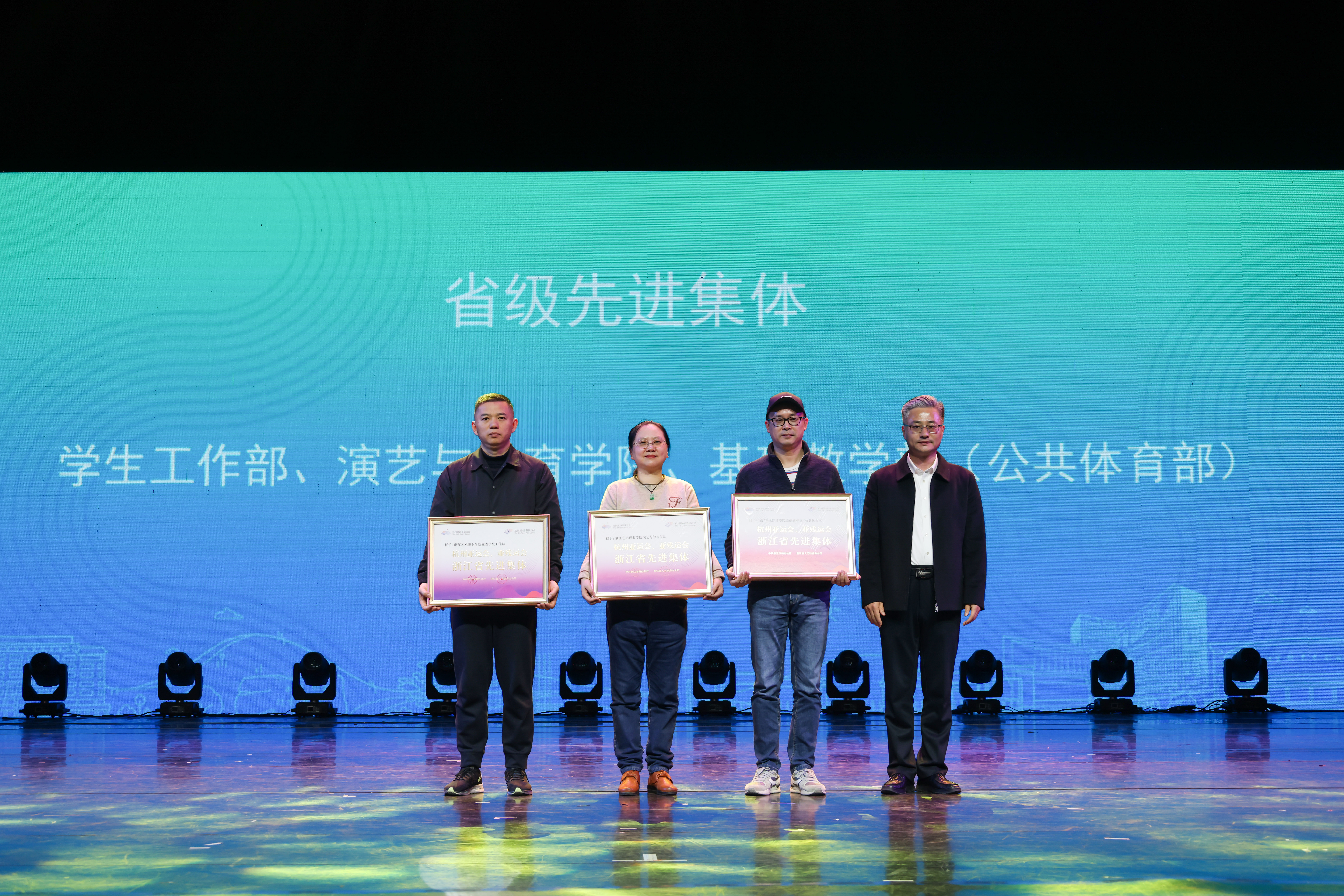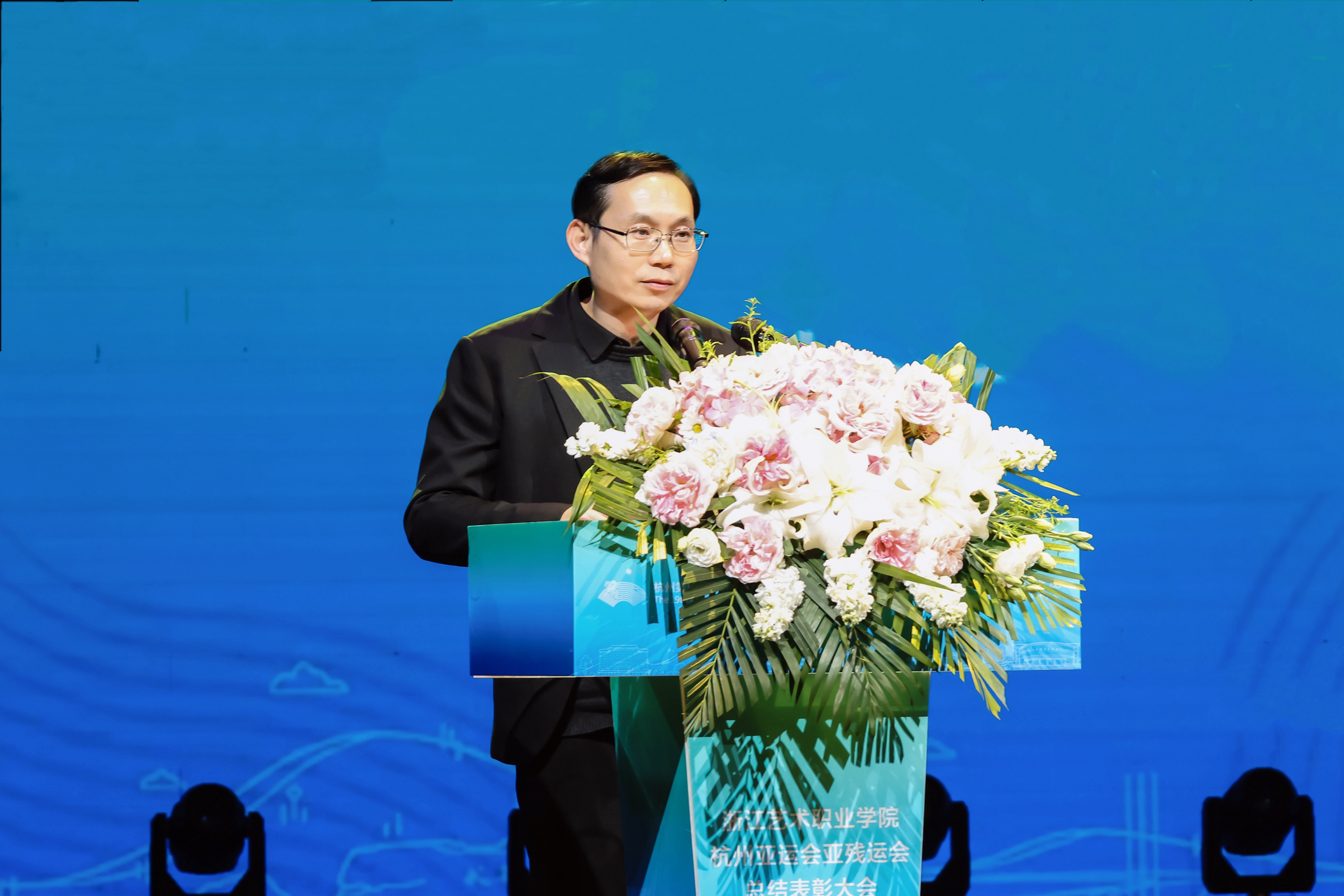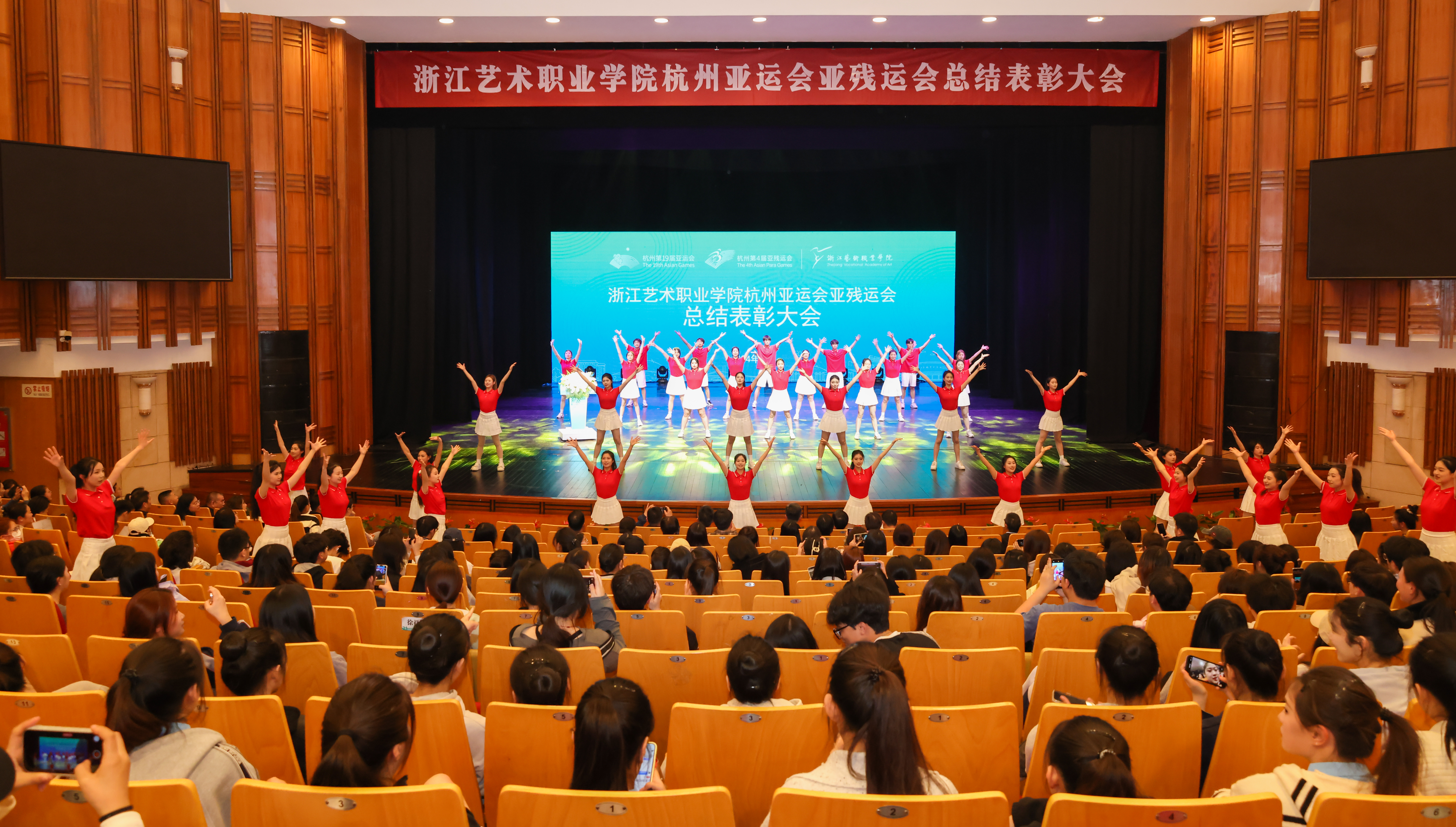 3月22日下午,浙江艺术职业学院杭州亚运会、亚残运会总结表彰大会在浙江实验艺术剧场举行。100多位为杭州亚(残)运会做出贡献的浙艺师生代表齐聚一堂,共话亚运。校领导班子成员,校属各部门、二级学院主要领导,师生代表参加。总结表彰大会由党委副书记、校长施俊天主持。