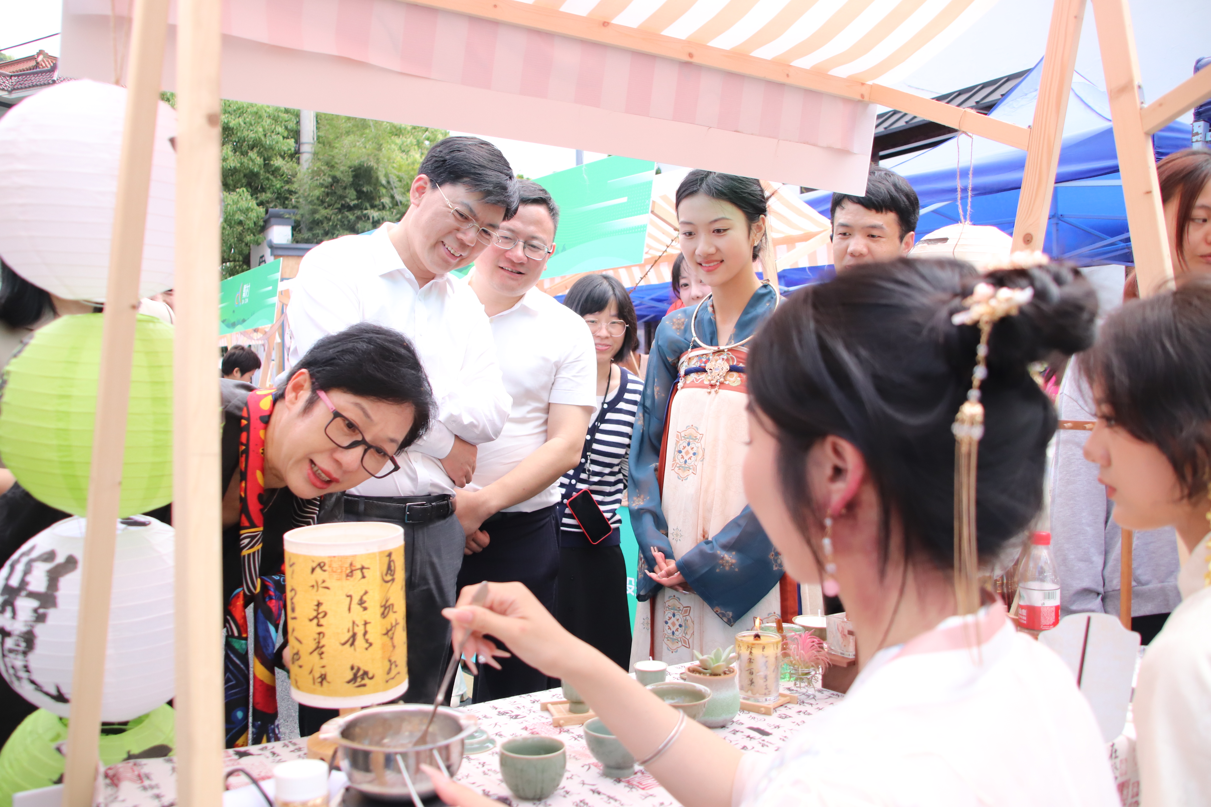 此次“国潮市集”活动由演艺与教育学院公共文化服务与管理专业师生倾情打造、首次亮相。如何对地方文化资源进行调查研究、收集整理、开发利用和交流展示,是现代公共文化服务专业人才必须具备的核心职业能力。为办好此次“国潮市集”,师生们多次考察走访戴村镇,深入研究戴村历史文脉,挖掘当地文化特色。同学们结合课堂所学,精心设计、反复打磨,以大石盖村的青瓷文化、“映山红”共富工坊、“初心菜园”等一件件富有戴村文化特色和内涵的文创产品让戴村传统文化焕发生机。