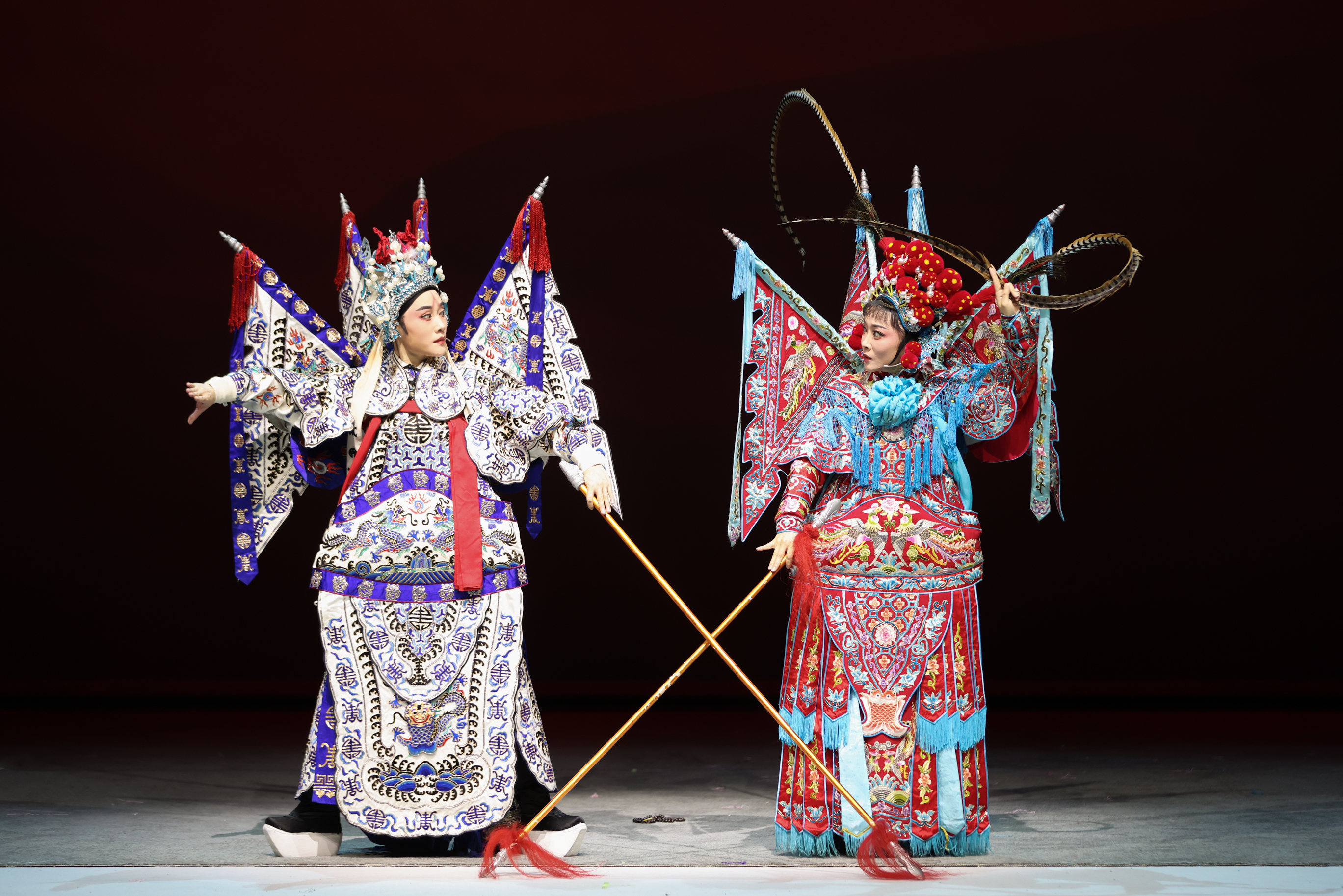 生、旦学员以《牡丹亭·惊梦》《牡丹亭·游园》开场,展示此次培训京、昆、晋、川等多元技艺课堂,展示长绸、褶子功、趟马、甩发功、长水袖等基本技巧,以四功五法展现戏曲艺术的精妙绝技。