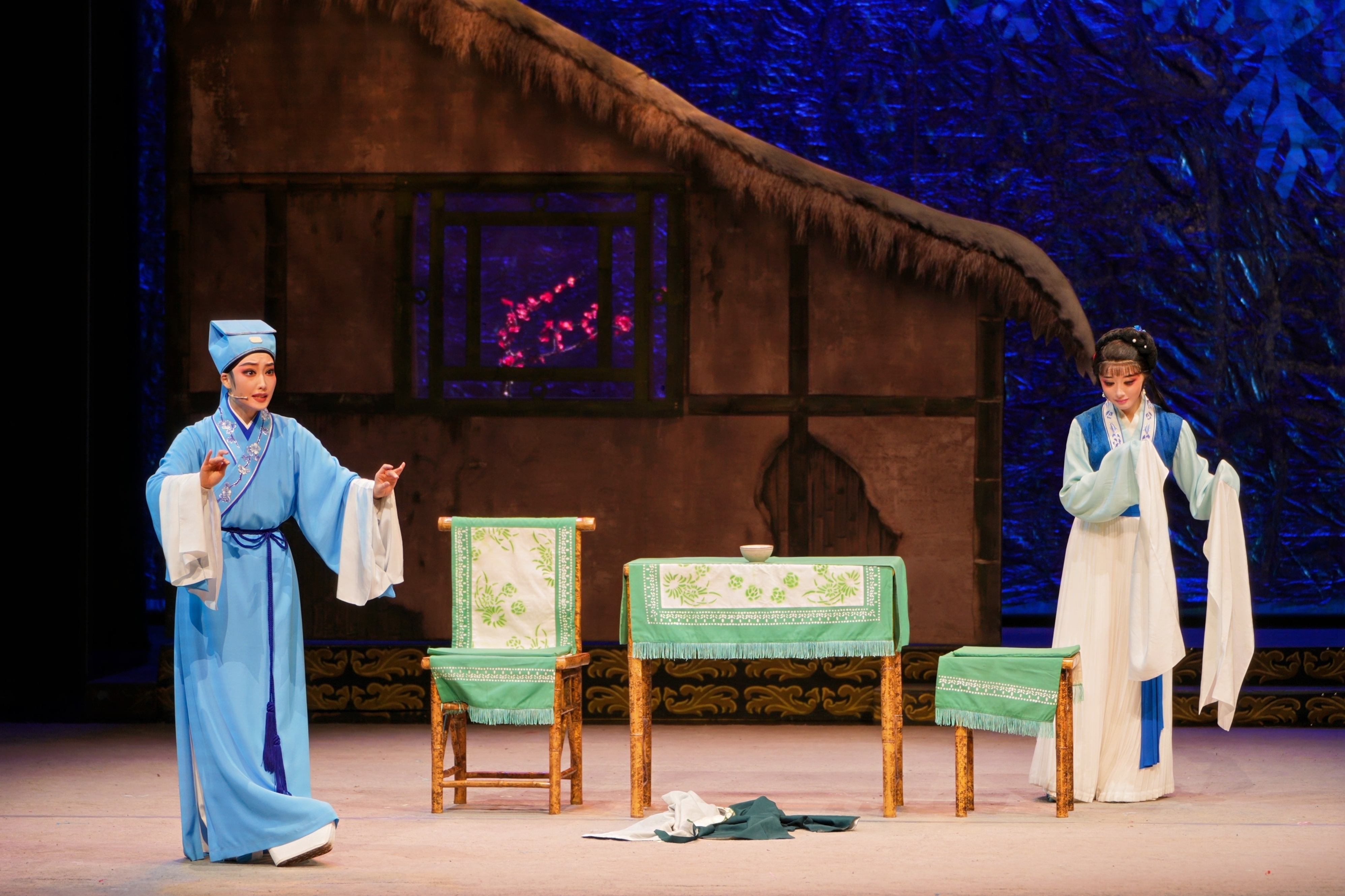随着大幕缓缓拉开,伴唱响起:“牡丹竞放笑春风,喜满华堂寿烛红。”同学们以清婉丽音、细腻表演,将这部经典剧目重新演绎得淋漓尽致。舞台上,她们或喜或悲,或怒或嗔,每一个动作、每一个眼神都充满了戏剧张力,让观众仿佛穿越时空,回到了那个充满爱恨情仇的时代。