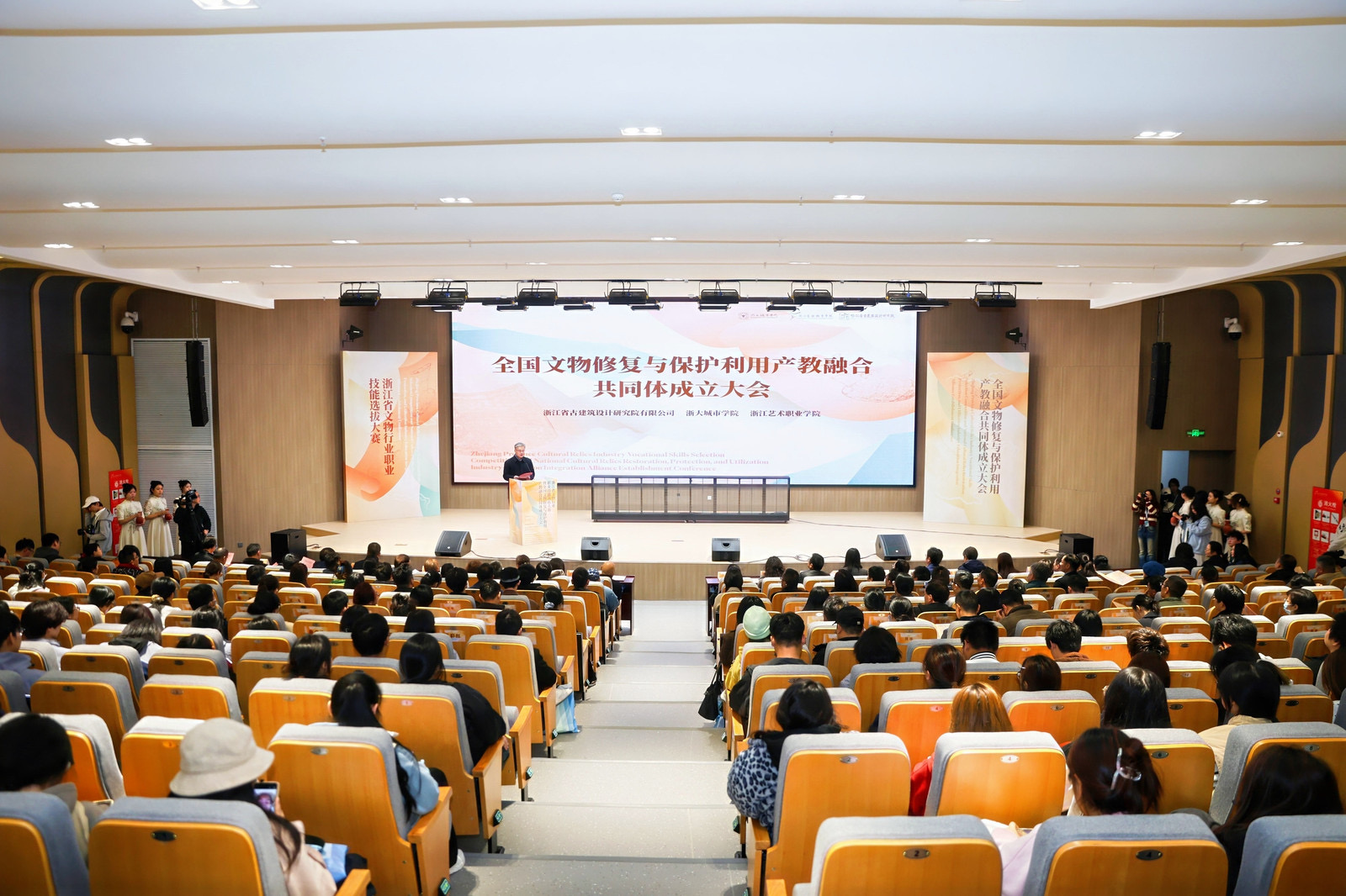 浙江省文物局副局长、二级巡视员郑建华,浙江省教育厅职成教处处长陈达,浙江省文化广电和旅游厅科技教育处(安全播出管理处)督查专员(正处长级)郑妮,浙江省古建筑设计研究院有限公司董事长卢远征,浙大城市学院副校长、党委副书记杨波,浙江艺术职业学院党委书记薛亮、校长施俊天,副校长徐芳、刘秀峰,中国文化遗产研究院原副院长、中国文物保护基金会原秘书长詹长法,浙江省古迹遗址协会副会长、研究馆员黄滋,故宫博物院馆员张志红,上海博物馆古陶瓷修复技艺国家级非遗代表性传承人蒋道银,中国文物学会文物修复委员会副主任贾文忠,湖北省博物馆副馆长李奇,河南省博物院研究馆员杜安,浙江省博物馆研究馆员楼署红,中国丝绸博物馆研究馆员汪自强,上海博物馆研究馆员张珮琛,上海博物馆副研究馆员褚昊以及成员单位代表、各地市文博单位代表,200余名浙艺手工艺学院师生共同见证这一历史时刻。大会由薛亮主持。