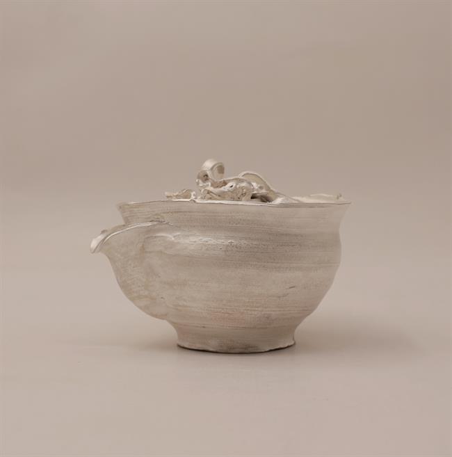创作理念:黏土真的很神奇,因有水的加持,柔软似丝绸划过指尖,因有火的加持,又回归岩石般质地。创作者只有谦卑地顺应泥性,才能通过土的语言来表达。本次宝瓶的创作手法纯粹,只拉坯不修坯,尽可能保留创作痕迹而一气呵成。捉手是拉坯过程中的边角料率意堆砌,瓶身椭圆壶口向内边稍倾,看似随意的手法又尽量满足实用需求,盈盈一握,出汤利索,烤银后的金属质感又增添了一份现代气息,与写意的创作手法相得益彰,是创作者内心的一次浪漫之旅。