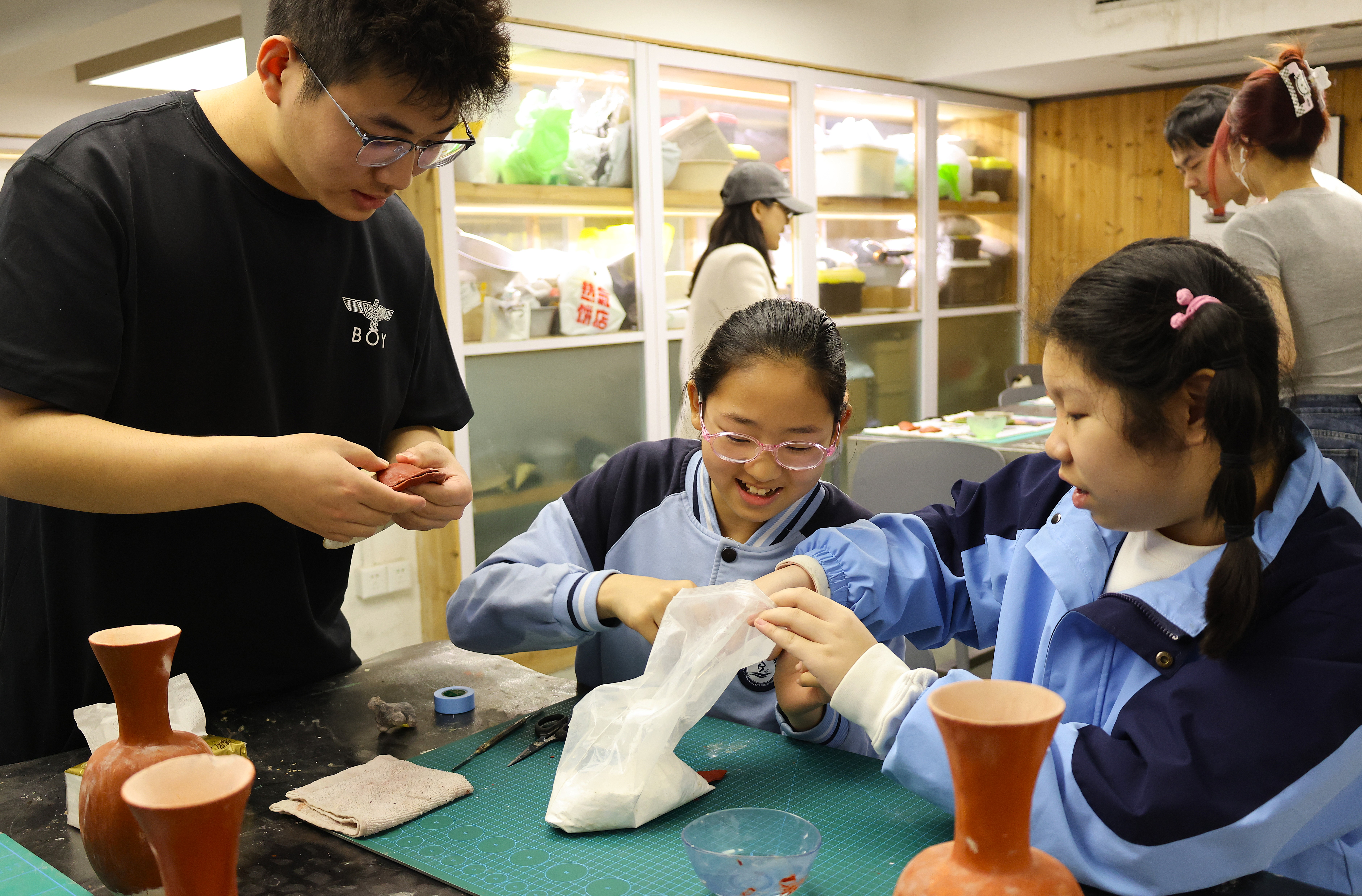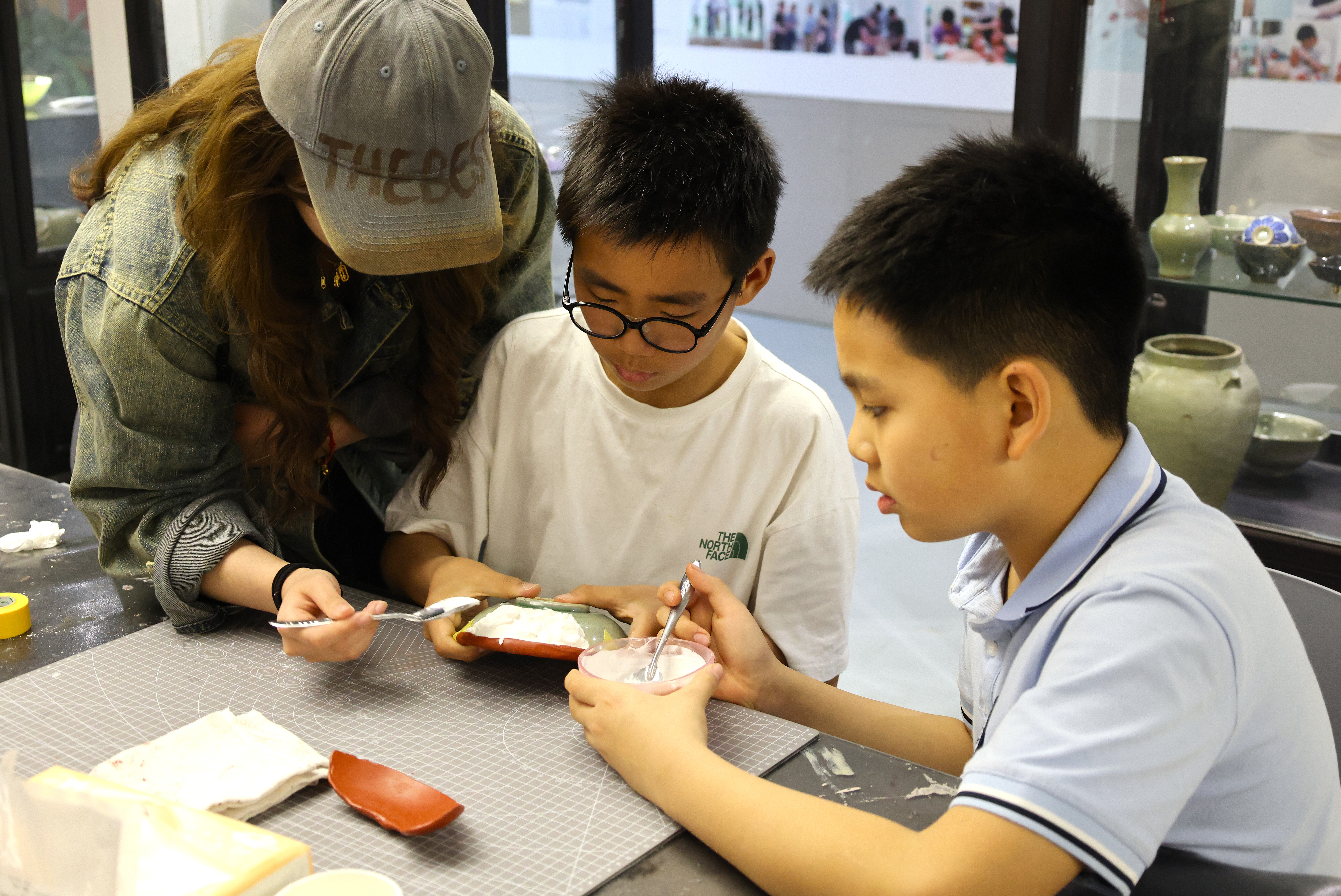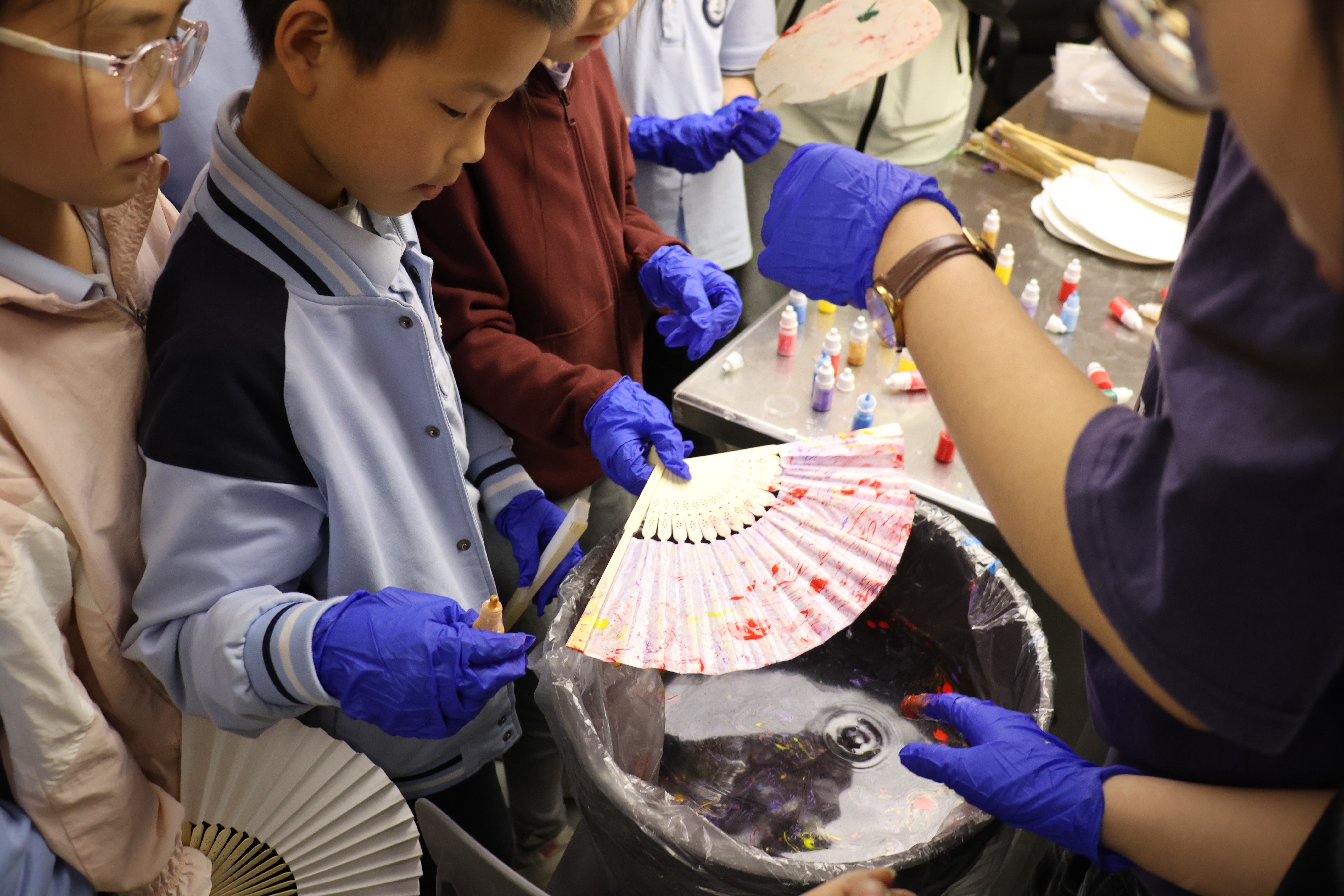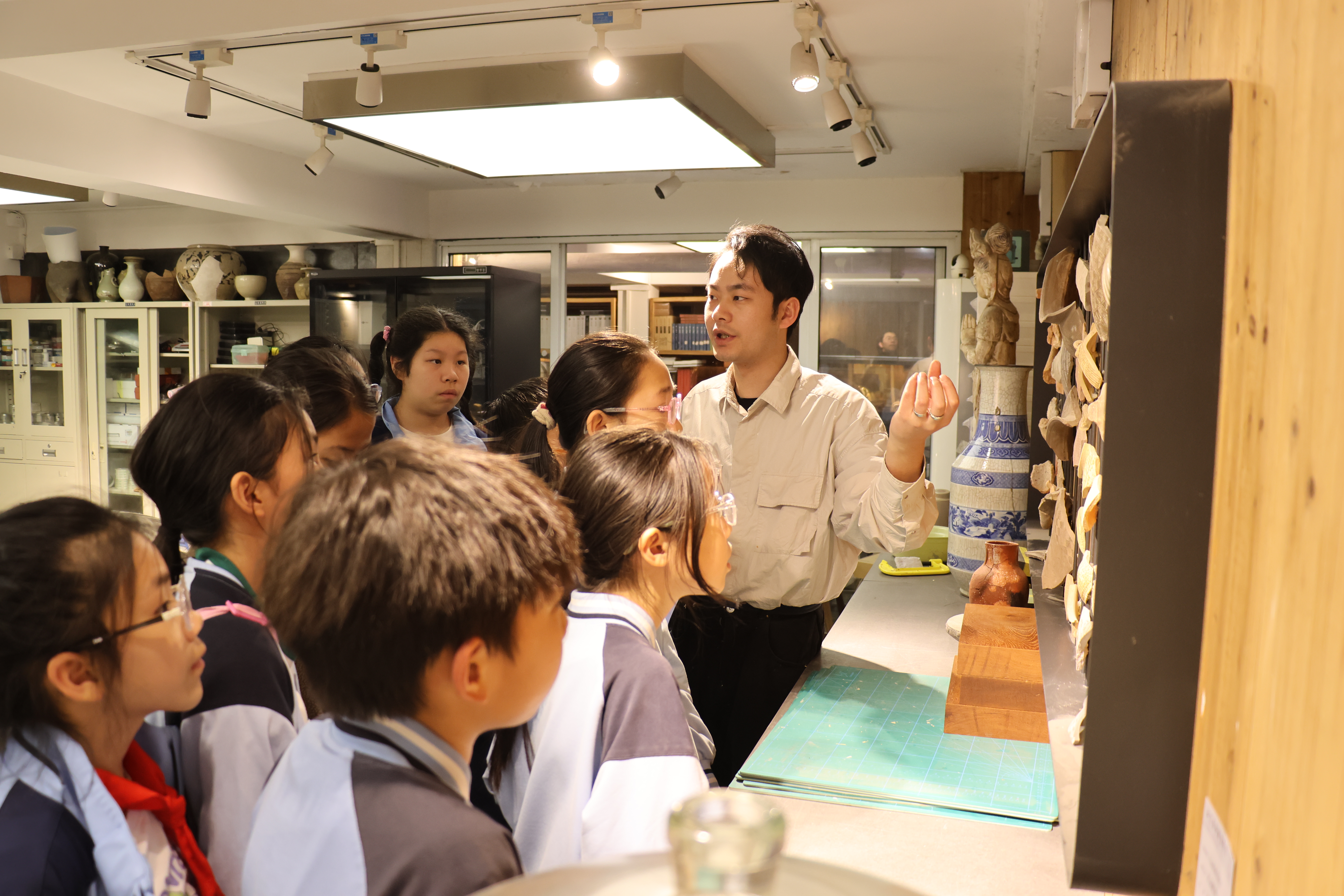 活动期间,朱伟洁、徐佳颖两位老师带领同学们参观了古陶瓷修复实训室。同学们亲自动手参与了器物补缺实践活动和漆扇制作体验,充分感受传统手工艺的独特魅力。