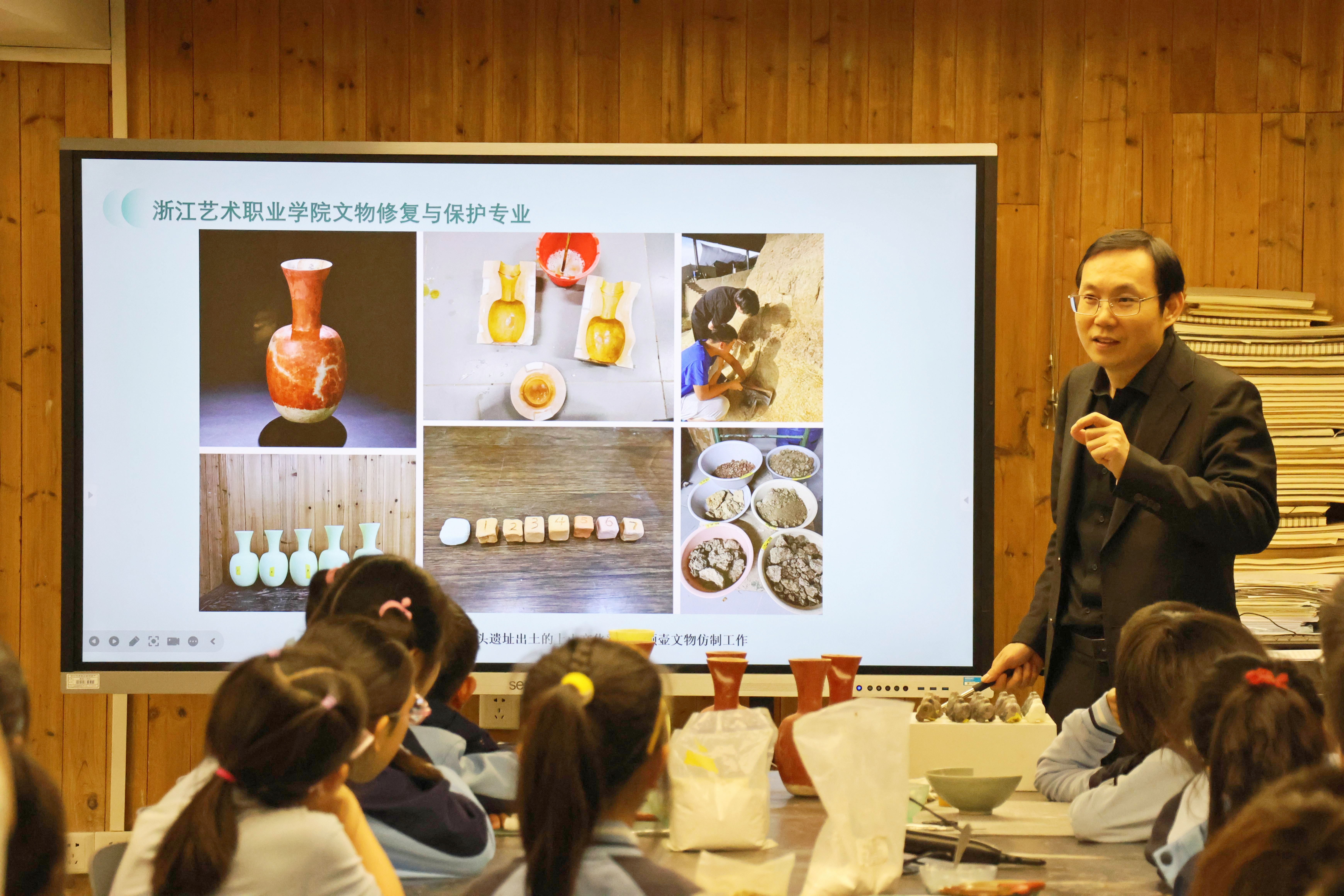 谈及文物保护的重要性,施俊天结合大型纪录片《我在故宫修文物》,详细讲述了文物修复的目的意义、原则、专业类别和主要艺术流程,并简要介绍了浙艺手工艺学院文物修复与保护专业建设情况。