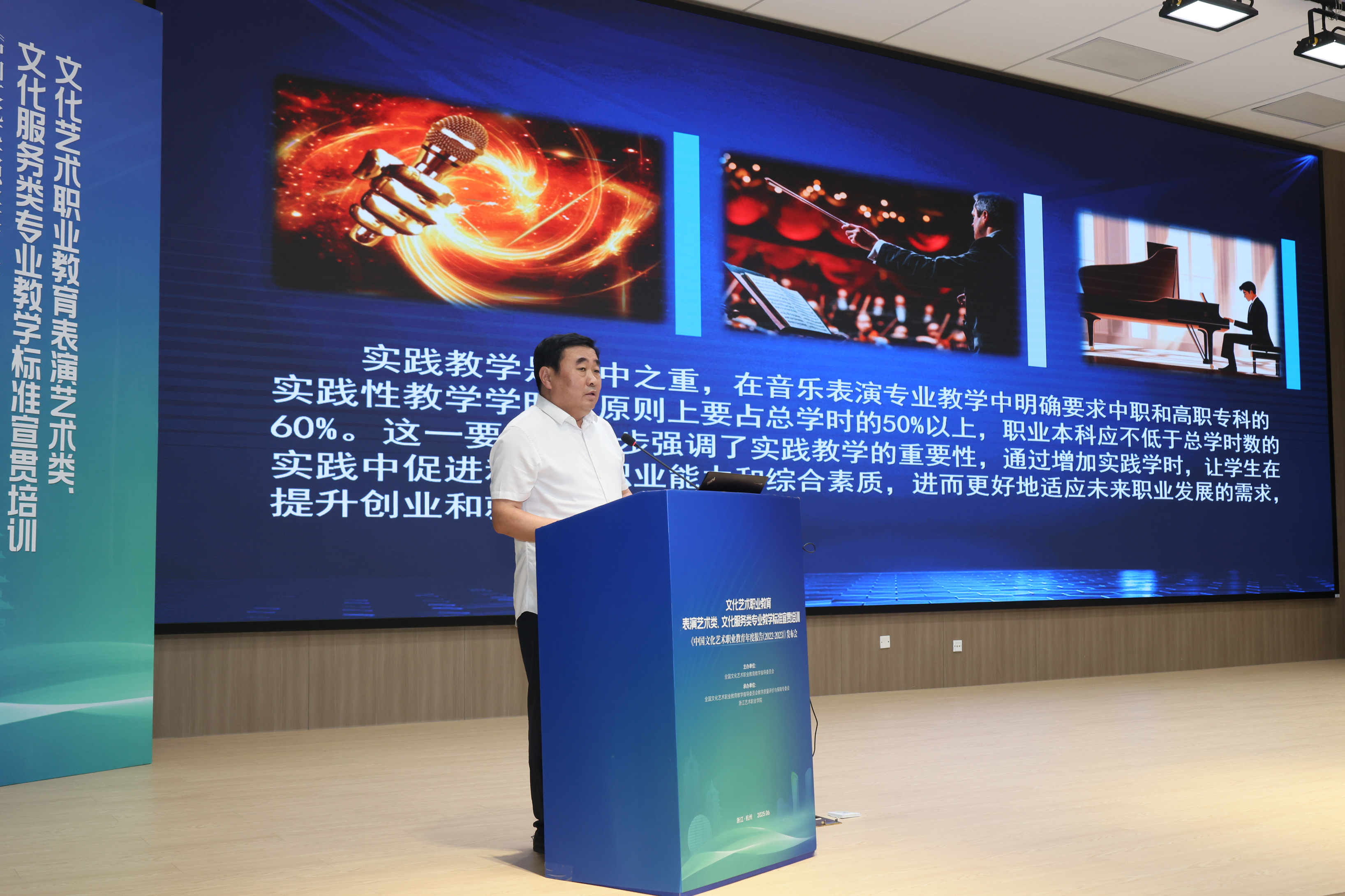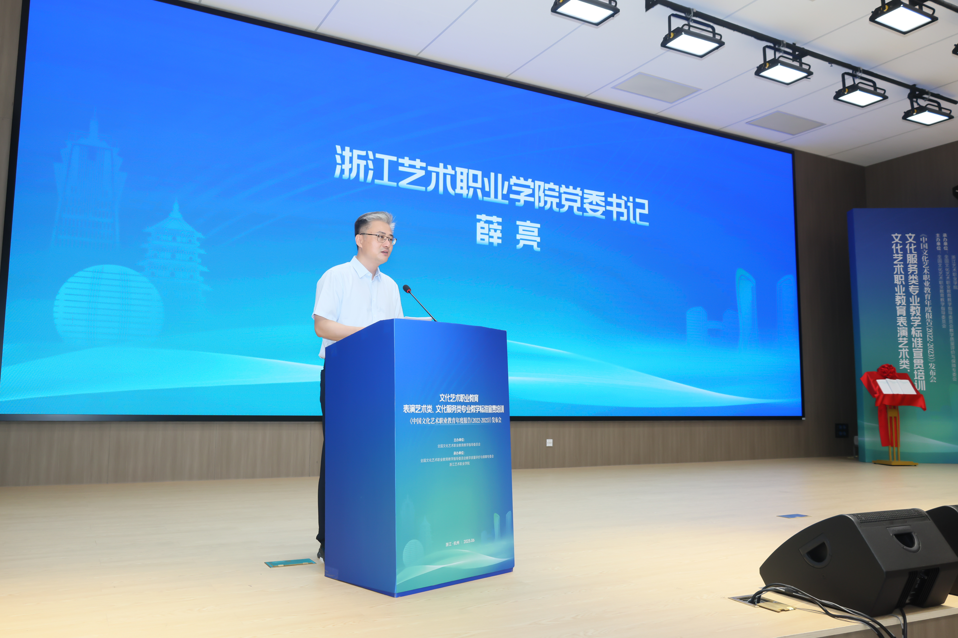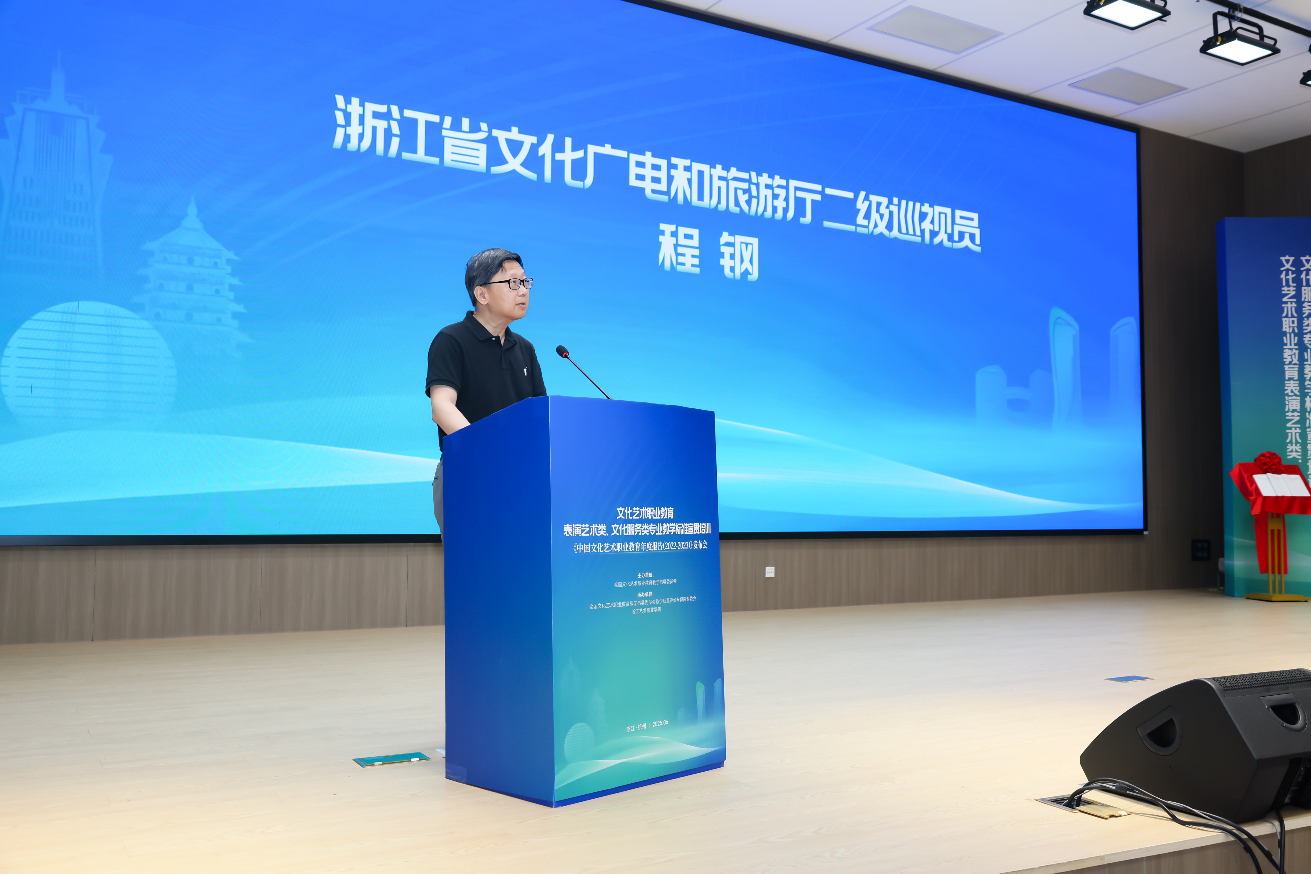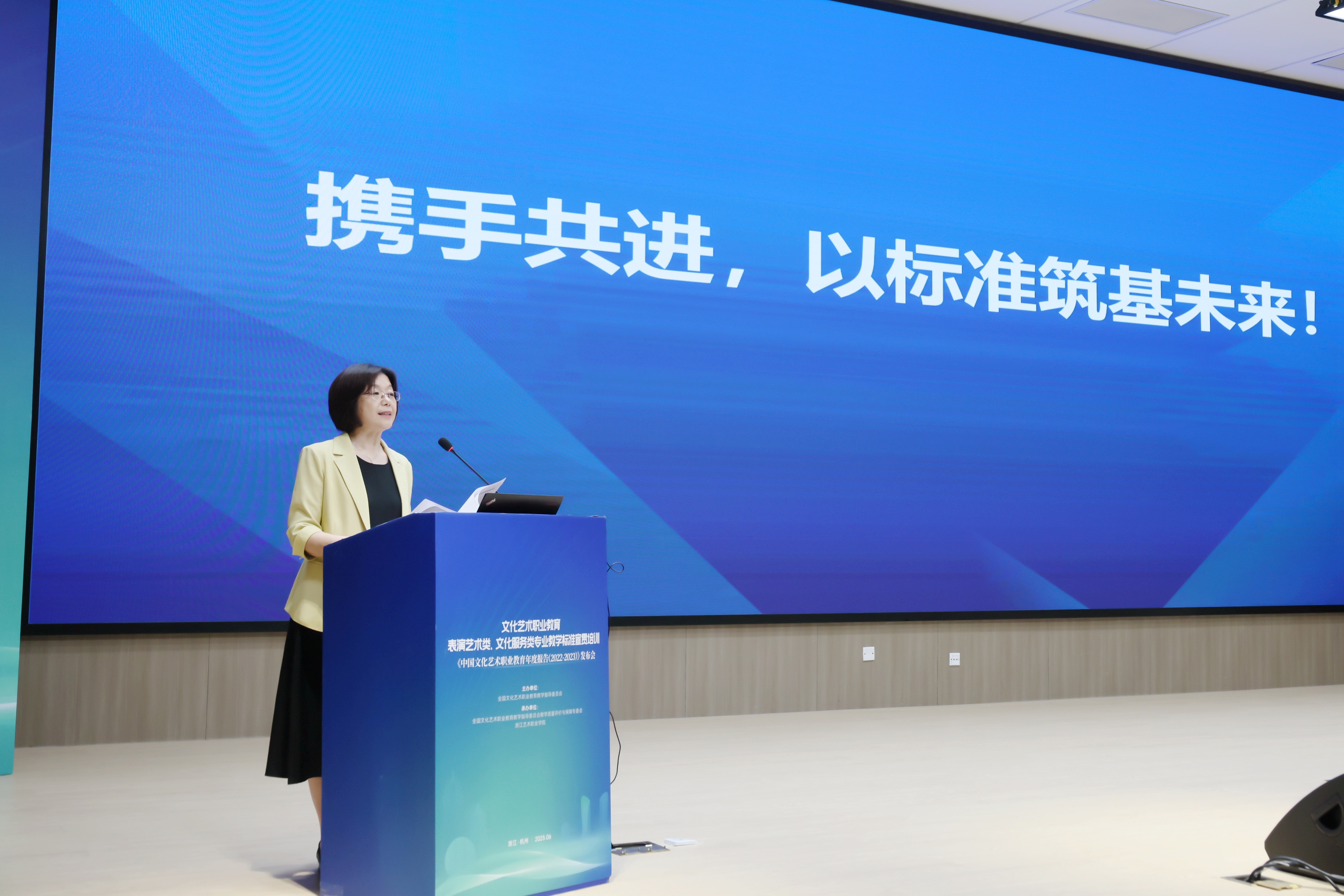 文化和旅游部科技教育司副司长刘冬妍,浙江省文化广电和旅游厅二级巡视员程钢,教育部标准研制综合组组长、教育部教育评估中心原副主任李志宏,文化艺术行指委副主任委员、文化艺术类标准研制工作组副组长黄杭娟,浙江艺术职业学院党委书记薛亮、校长施俊天等出席,近200位文化艺术行指委委员和艺术职业院校负责人、专业带头人、骨干教师等齐聚一堂,共同解读和探讨新版文化艺术类专业教学标准。