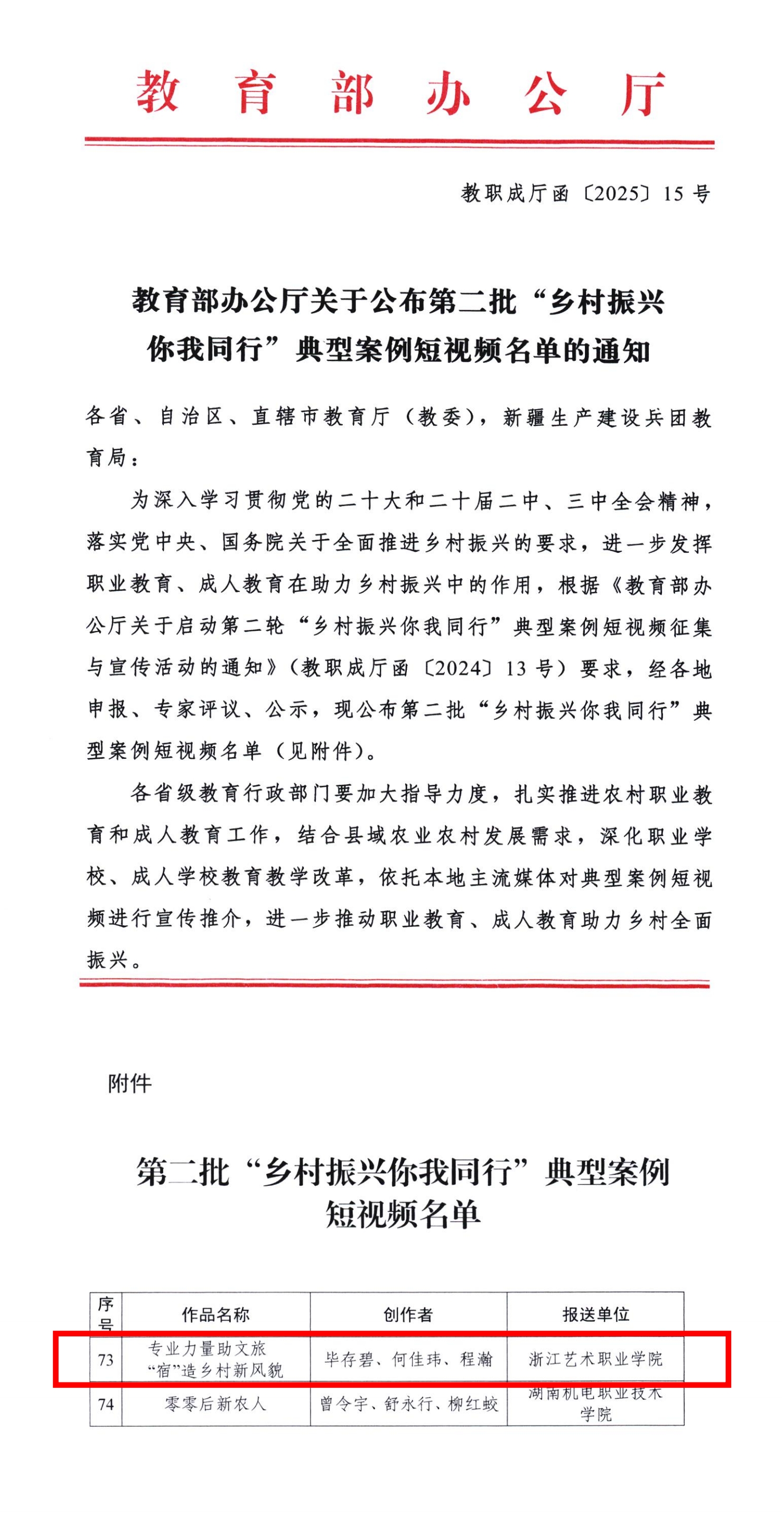 近日,教育部办公厅公布了第二批“乡村振兴你我同行”典型案例短视频名单。我校报送的案例《专业力量助文旅 “宿”造乡村新风貌》成功入选。