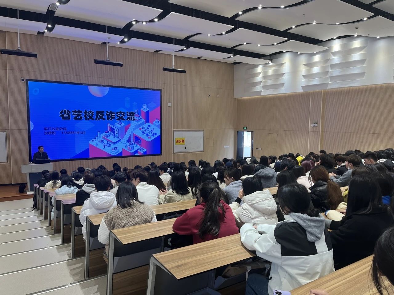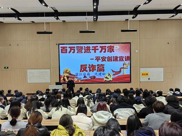 为进一步遏制电信网络诈骗案件发生,增强学生的反诈防骗意识,持续加强反诈宣传教育,切实守护校园安全。3月19日,音乐学院、校保卫处在阶梯二教室联合开展校园防诈骗教育,邀请杭州市公安局滨江分局一级警长沈建松警官主讲,音乐学院全体高职学生参加。