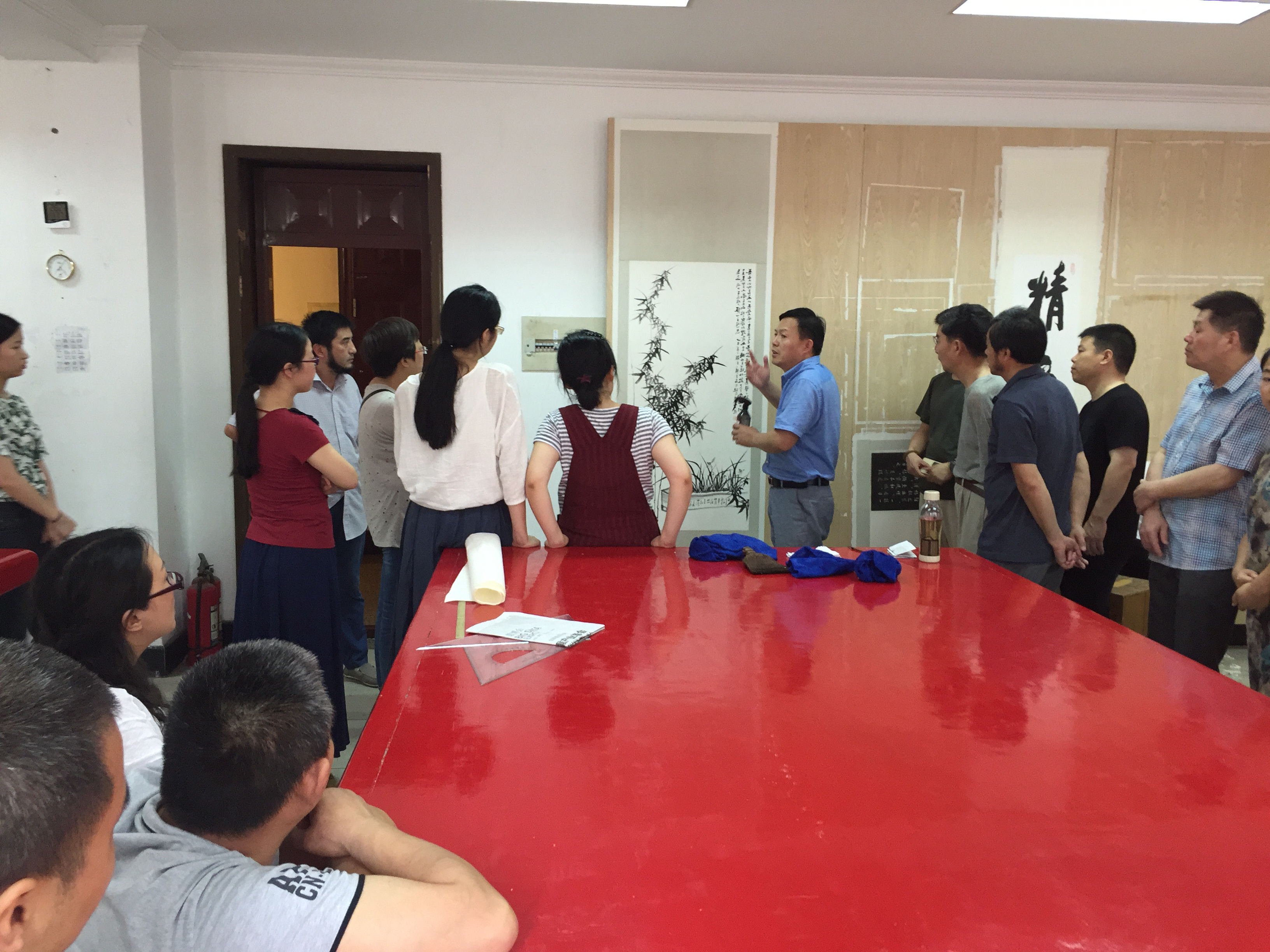 应浙江公共文化管理学院的邀请,6月中国丝绸博物馆技术部主任、中国纺织品鉴定保护中心副主任,复旦大学硕士生导师、研究馆员汪自强前来浙艺为2016年中国非物质文化遗产传承人群培训班的学员开设为期5天的书画装裱课程。每次上现场课,学员们会将示范操作用的工作台围得满满当当,想要近距离学习观摩汪老师的授课过程。时而用刀裁剪,时而上墙揭裱,汪老师以其娴熟利落、悠然自得的一系列专业操作引来身旁学员们的啧啧惊叹。