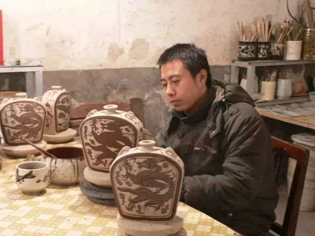 刘鹏润说,学习磁州窑非常难,单单是装饰方法就有近百种,需要对所有的泥料、釉料、纹饰、画面、烧制有相当精准的掌握。磁州窑以画工见长,需要扎实的基础,从小他就拿着毛笔,以水为墨,以地为纸,日复一日地练习绘画技巧。